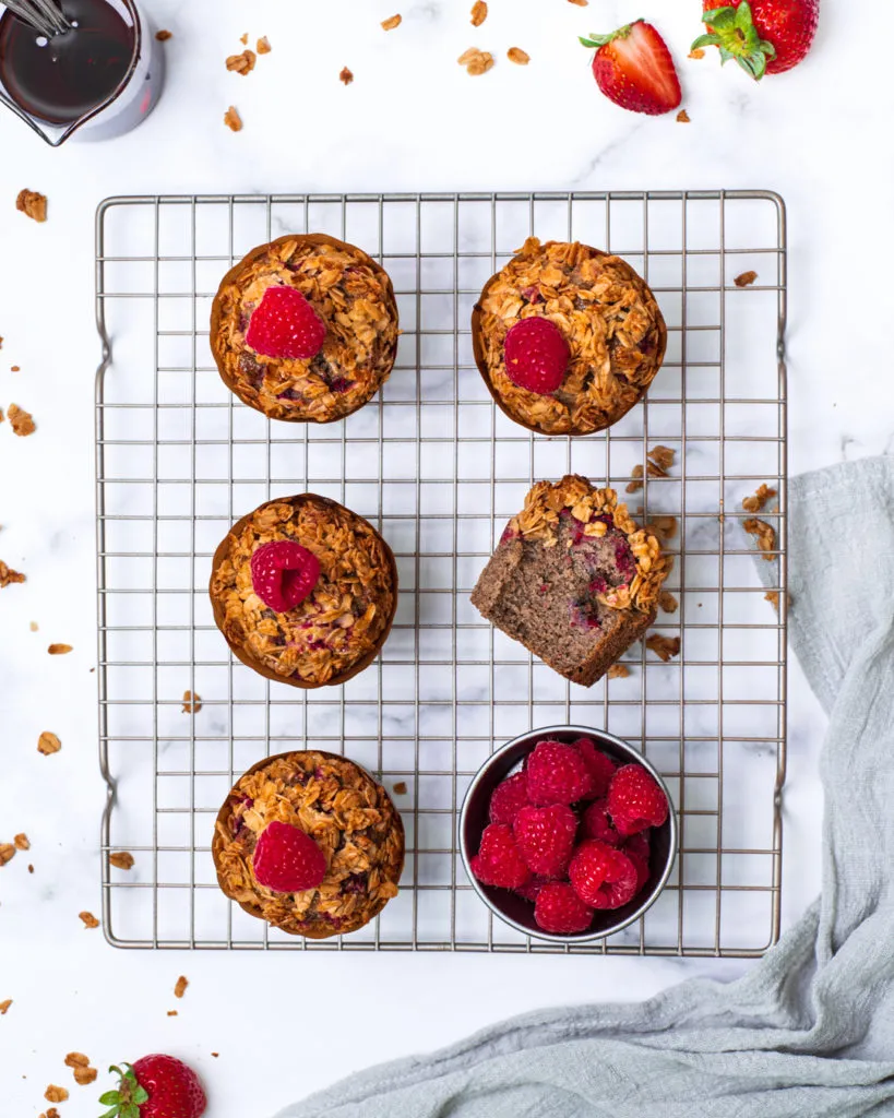 This recipe is gluten-free, vegan, dairy-free and refined sugar-free. These delicious banana raspberry streusel muffins are sweetened naturally with bananas and maple syrup. You can enjoy that concentrated banana taste and caramel-like maple syrup aroma. These fluffy muffins are topped with crunchy streusel, best served with a cup of coffee for a perfect breakfast or afternoon snack.