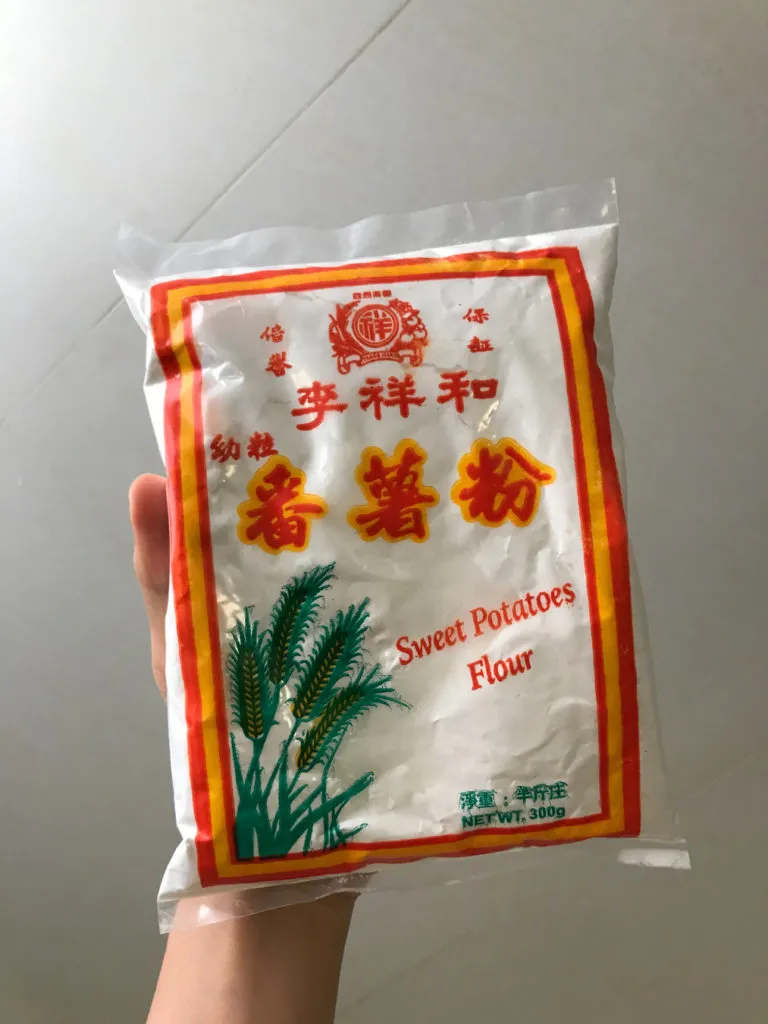 You may try to find sweet potato starch in Asian grocery stores or supermarkets. Be careful that the package of the starch is sometimes confusing as the name may be labelled as ‘Sweet Potato Flour’ like the one below. You can tell from their appearance - sweet potato starch is white in color (see below picture) while sweet potato flour is usually pale yellow.