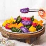 One reason why I love veggies is that I can always create vibrant dishes using their nature colors. There are so many colors of plants you can choose! In this recipe I used beet powder, carrot juice, curry powder, spinach juice and purple cabbage juice to ‘dye’ my dumplings naturally. A simple way to make your dish attractive and increase your appetite!
