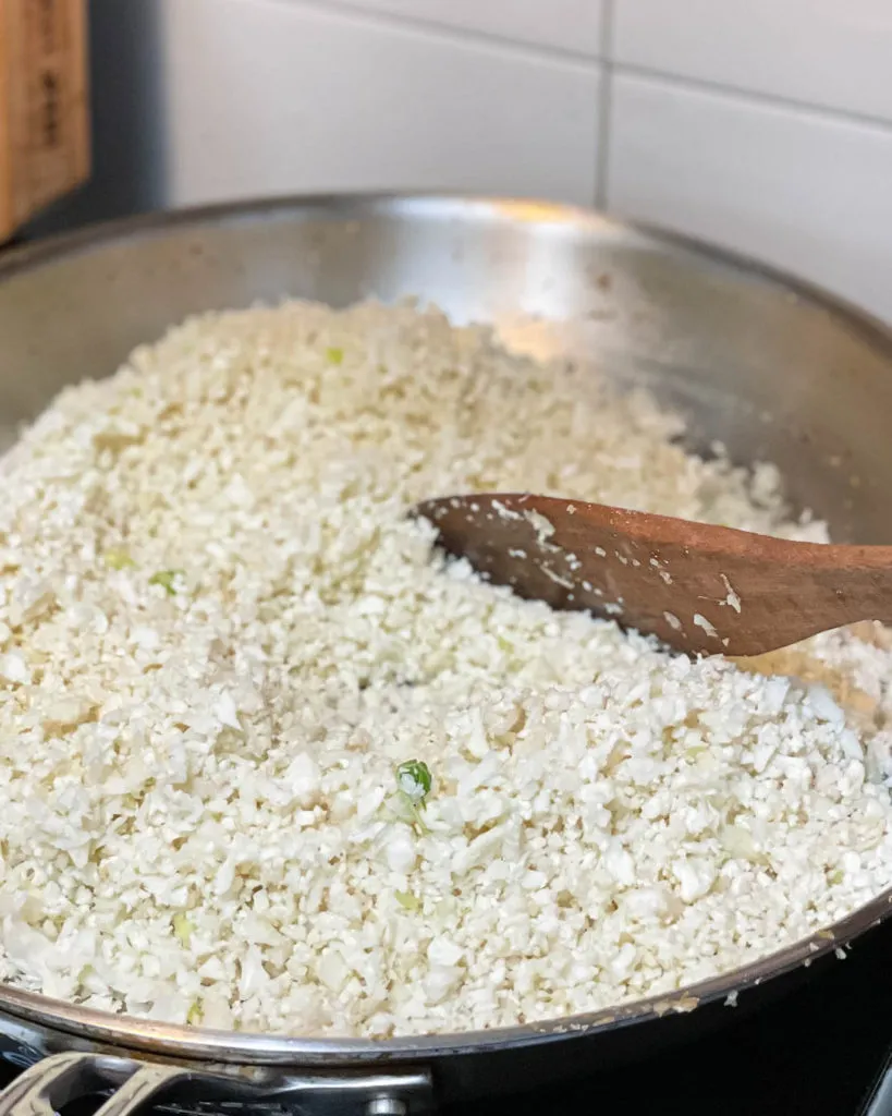 - Heat a tablespoon of olive oil in a large frying pan (about 12” diameter) over medium high heat. Sauté a batch of garlic and shallots until fragrant, then turn to high heat and add the cauliflower rice to stir fry until it turns pale yellow, for about 3 minutes.