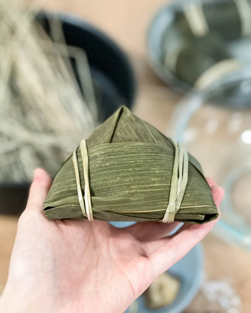 - Tight the dumpling with a twine. Cut the redundant part of leaves. Repeat the steps until all ingredients are used.