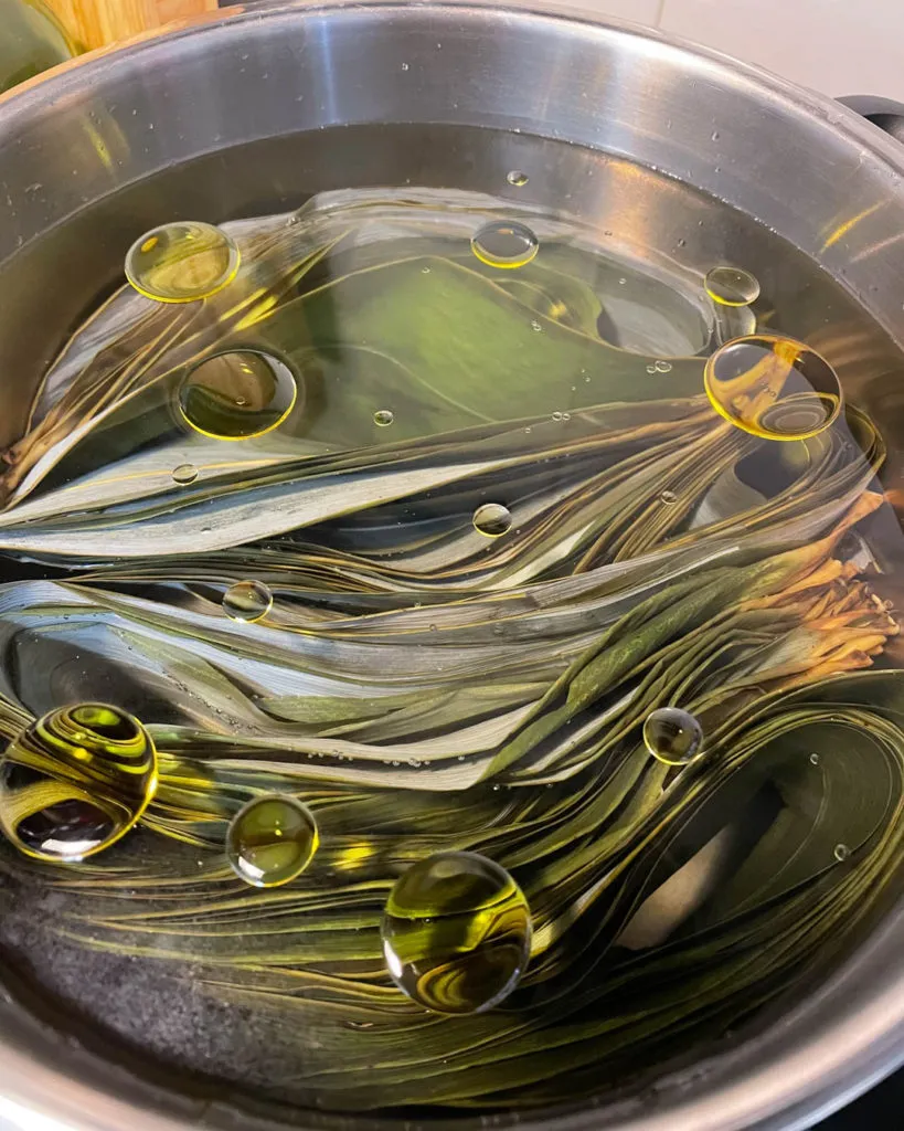 - Put on the pot lid and heat the pot of leaves over high heat until it boils, then turn off the heat immediately. Keep the lid on and let the leaves soak overnight or until the water is warm enough to touch (if you don’t have enough time).