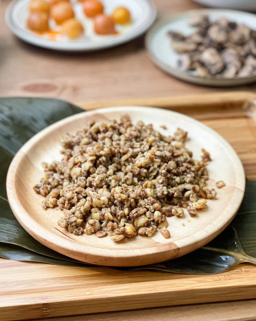 Made from fermented soybeans, tempeh is a high protein, nutritious but keto-friendly plant-based ingredient. In this recipe we are going to stir fry our tempeh to remove its unpleasant taste, while resembling the taste and texture of mung beans for our low-carb rice dumplings!