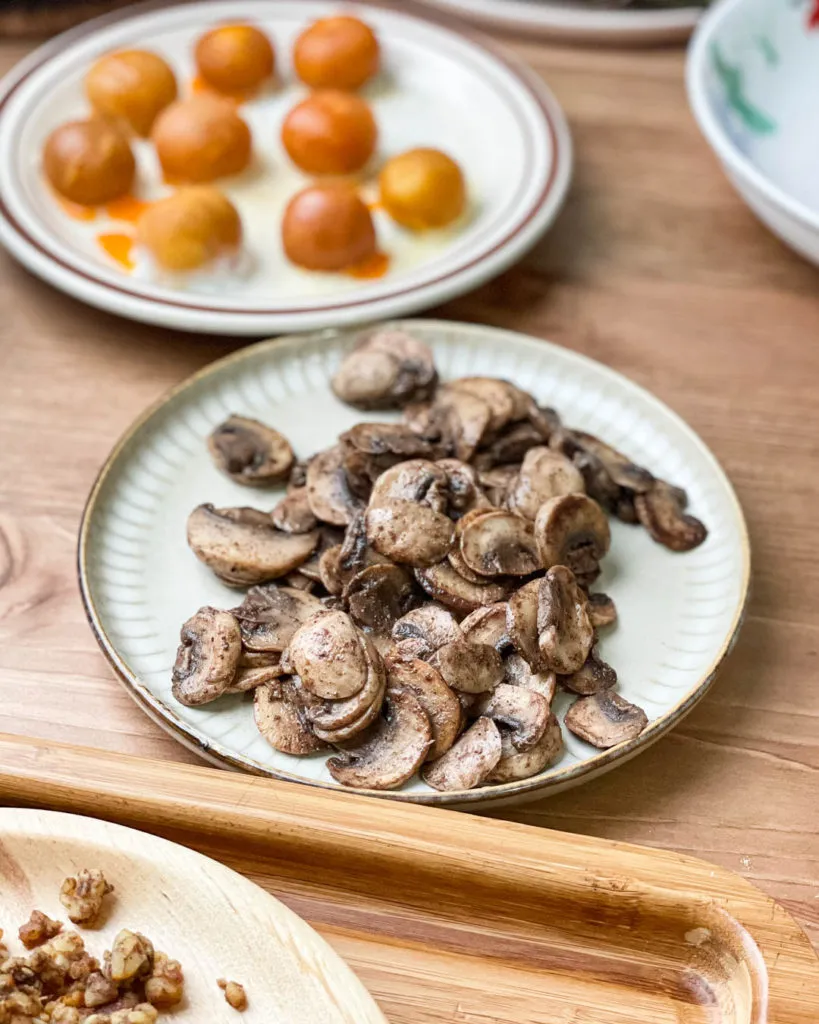 - In a frying pan, heat a tablespoon of olive oil over medium heat, sauté mushroom slices until golden brown and soft, then season with sea salt and five spice powder and stir to combine. Taste and add more seasoning if necessary. Plate up the mushrooms and set aside.
